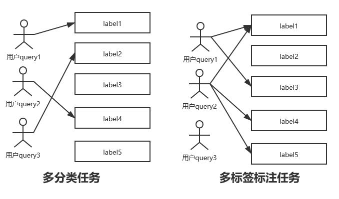 多分类任务的特点是一条用户query只能属于一个标签。二分类是多分类任务的特例,如果我们现在用来识别用户query是不是属于传奇标签,这就是一个最简单的二分类任务。属于和不属于可以分别代表label1和label2。