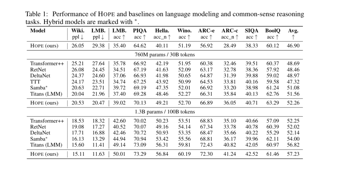 谷歌在语言建模和常识推理任务上做了大量实验,HOPE的表现全面超越了Transformer和其他主流架构(比如RetNet、DeltaNet、Titans)。