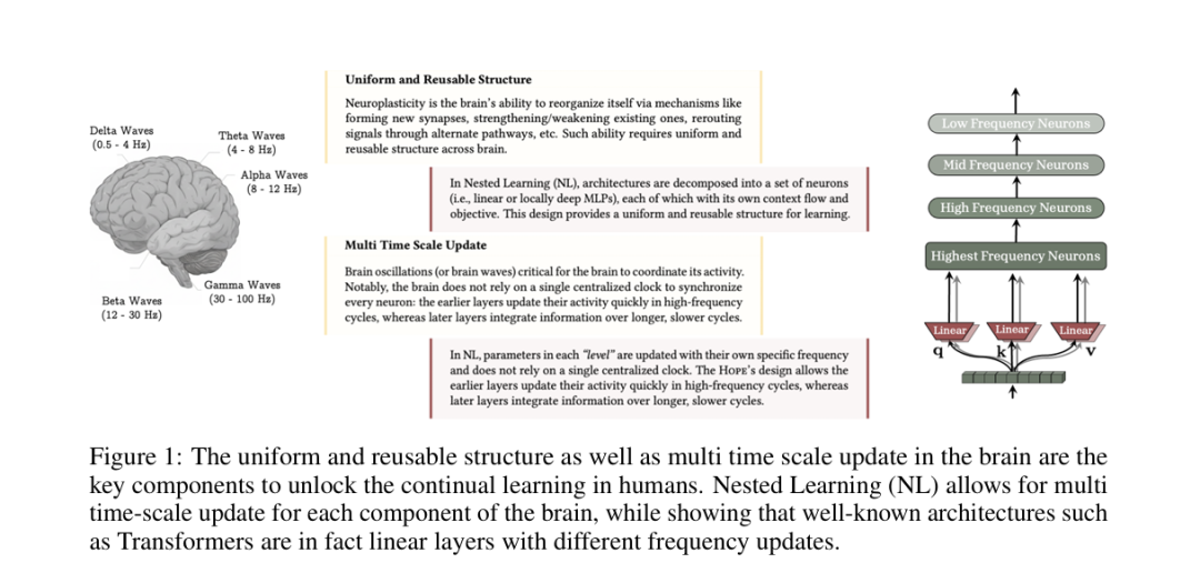人类之所以能持续学习,关键在于大脑有一套“多频率的记忆巩固机制”——不是简单的“短期记忆+长期记忆”二分,而是从高频到低频的连续体。嵌套学习的核心灵感,就来自于这个神经学原理。