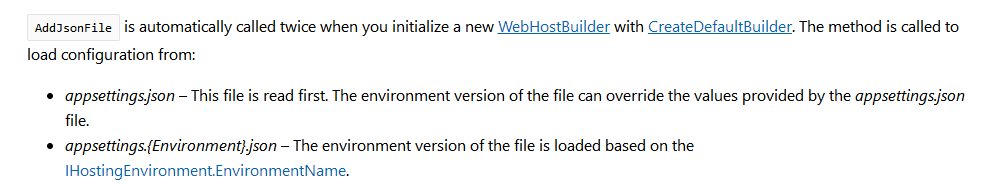 CreateDefaultBuilder方法(2.0新增[4])会调用2次AddJsonFile(),第1次加载appsettings.json,第2次加载appsettings.{Environment}.json,而Environment取至IHostingEnvironment.EnvironmentName,即环境值。对应源码[5]: