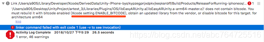 本文记录了在Unity2017.4.13.1与EasyARSDKBasicVersion2.2.0集成过程中遇到的链接错误,详细描述了错误信息为“ShowingAllMessages/clang:-1:linkercommandfailedwithexitcode1(use-vtoseeinvocation)”,并分享了解决此问题的方法。