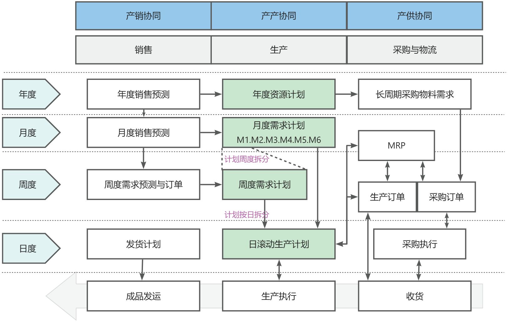 “产产协同”是计划体系的内核,它将销售侧的需求,转化为内部可执行的资源计划、需求计划和生产计划。图中“月度需求计划”下列出的M1至M6,代表长达半年的滚动计划视野