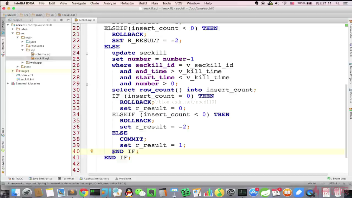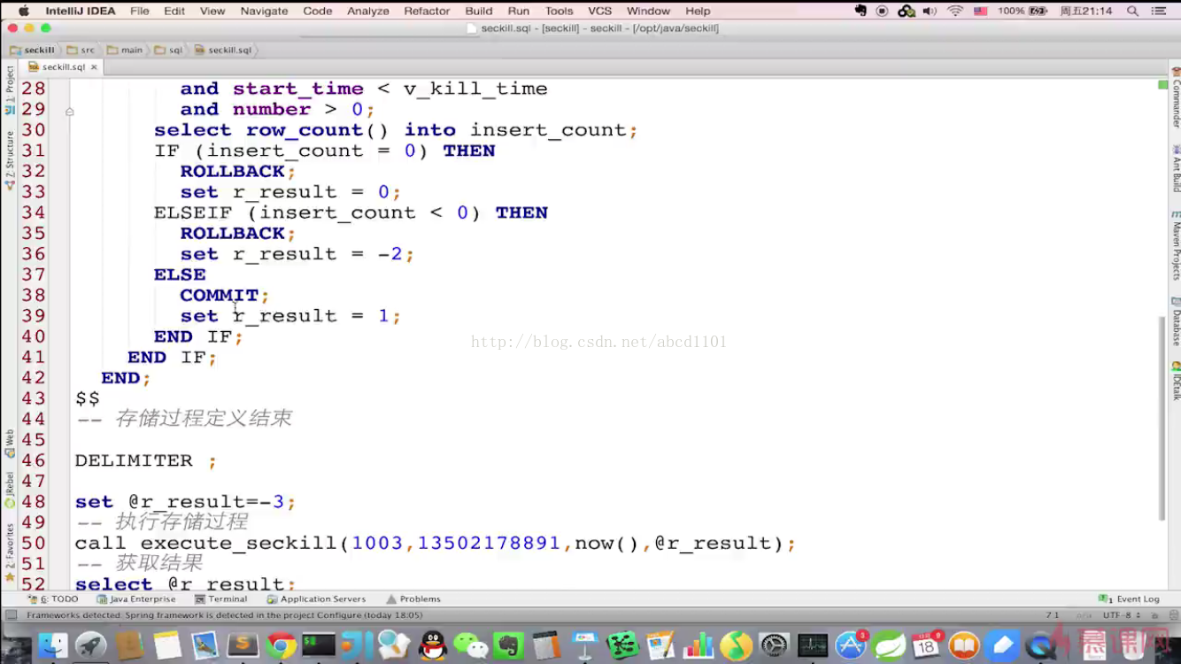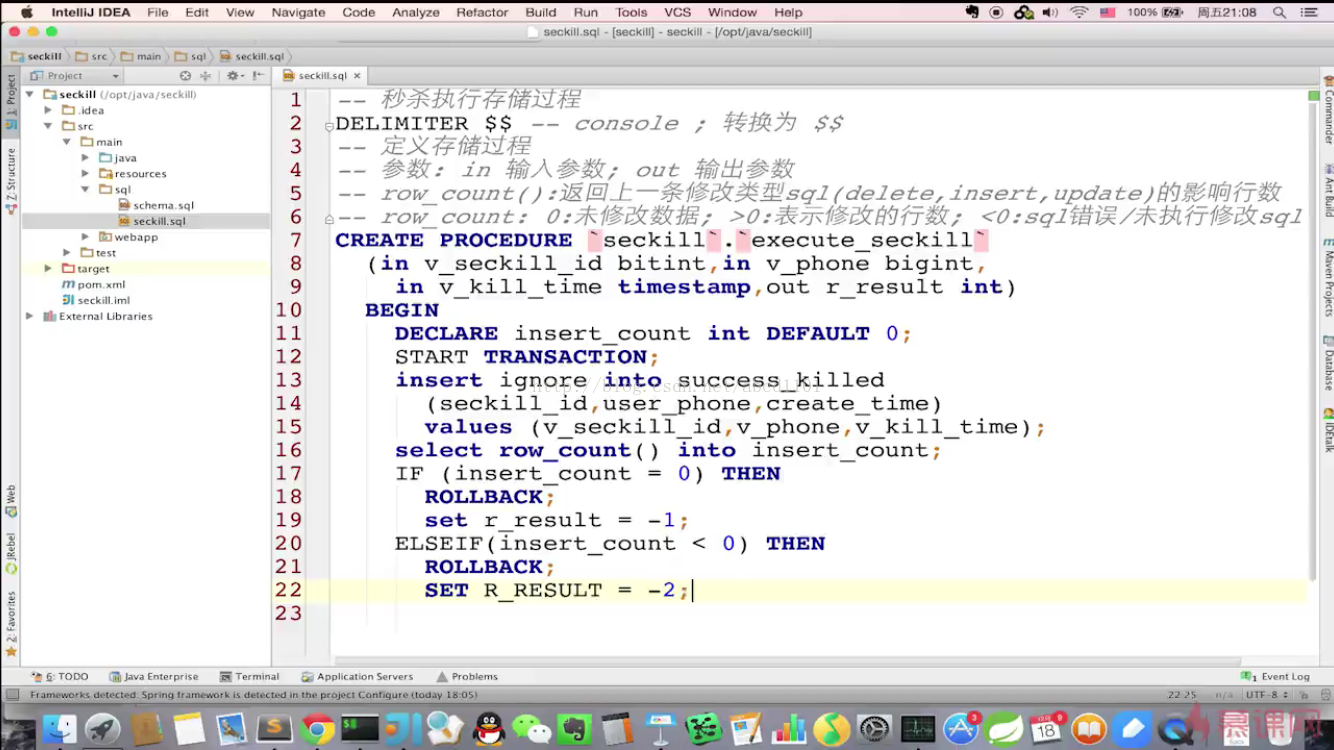 <tx:annotation-driven transaction-manager="transactionManager"/> - 在业务类的executeSecKill方法中添加上@Transactional事务注解