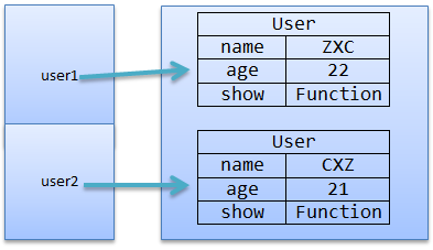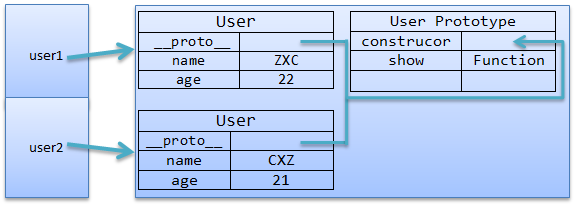 function User(name,age){//构造方法 this.name = name;//对象属性 this.age = age; } User.prototype.addr = '湖北武汉';//在原型中添加属性 User.prototype.show = function(){//在原型中添加方法 alert(this.name+'|'+this.age); }; var user1 = new User('ZXC',22);//创建实例 var user2 = new User('CXZ',21); user1.show();//调用show()方法 user2.show(); alert(user1.show == user2.show);//返回 true 说明show方法是共享的 alert(user1.addr);//'湖北武汉' alert(user2.addr);//'湖北武汉'