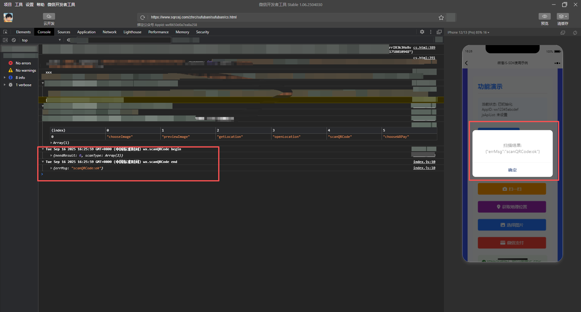 这边以扫一扫为例子,初始化校验签名成功的话就会出现我下面圈出来的,然后再点一下扫一扫,