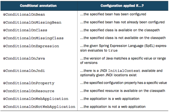 Spring Boot 实现了一系列的Conditional Annotation。这些基本上是可以见名知意的。下面就是一部分常见的条件注解(Conditional Annotation)。