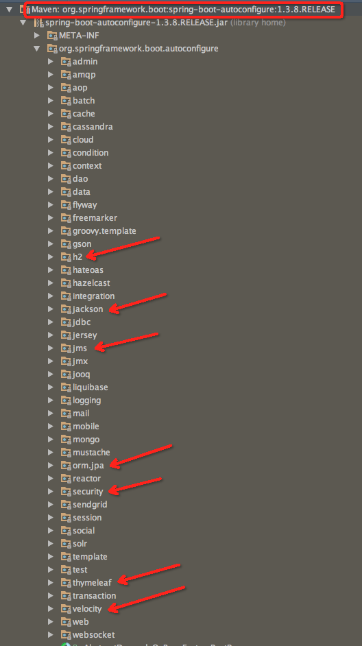 在应用中使用Spring Boot的时候,spring-boot-autoconfigure这个jar包会被引入进来,这个Jar包里面包含了一些配置类。这个包里的所有都在应用的claspath上,都有可能在自动配置执行的过程中被用到,从而简化应用的配置工作。这个jar的内容大致是下面这个样子: