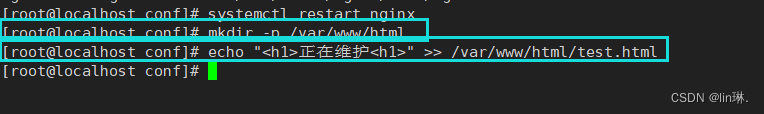 echo "<h1>正在维护<h1>" >> /var/www/html/test.html