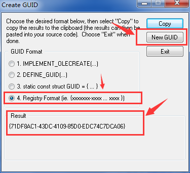 2) 点击进去后进入生成Guid值的界面,选择“Registry Format”项,再点击右边的“New Guid”,在最下方“Result”栏类出现的就是Guid值。
