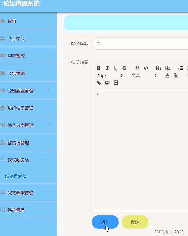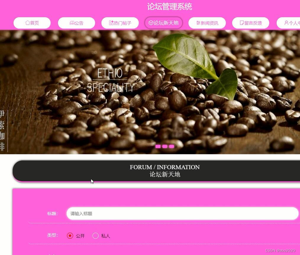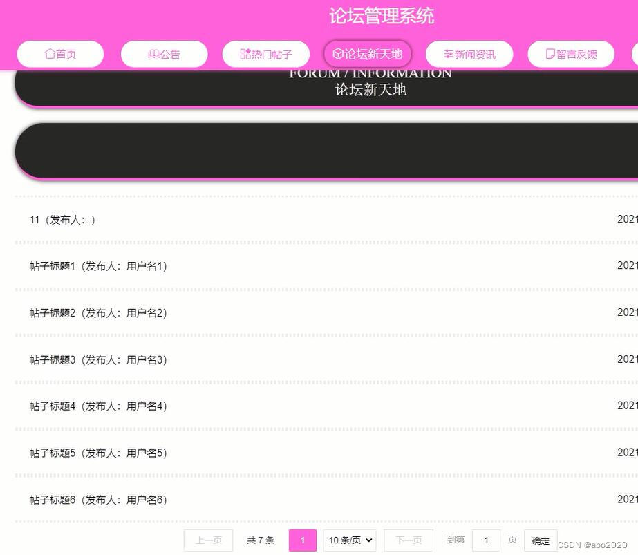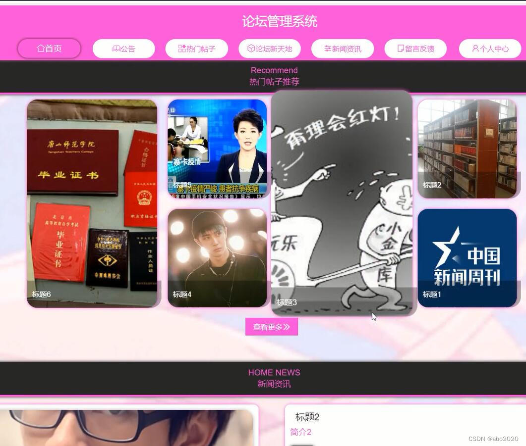 本论文系统地描绘了整个网上论坛管理系统的设计与实现,主要实现的功能有以下几点:管理员;首页、个人中心、用户管理、公告管理、公告类型管理、热门帖子管理、帖子分类管理、留言板管理、论坛新天地、我的收藏管理、系统管理,前台首页;首页、公告、热门帖子、论坛新天地、新闻资讯、留言反馈、个人中心、后台管理、客服中心,用户;首页、个人中心等功能,其具有简单的接口,方便的应用,强大的互动,完全基于互联网的特点。