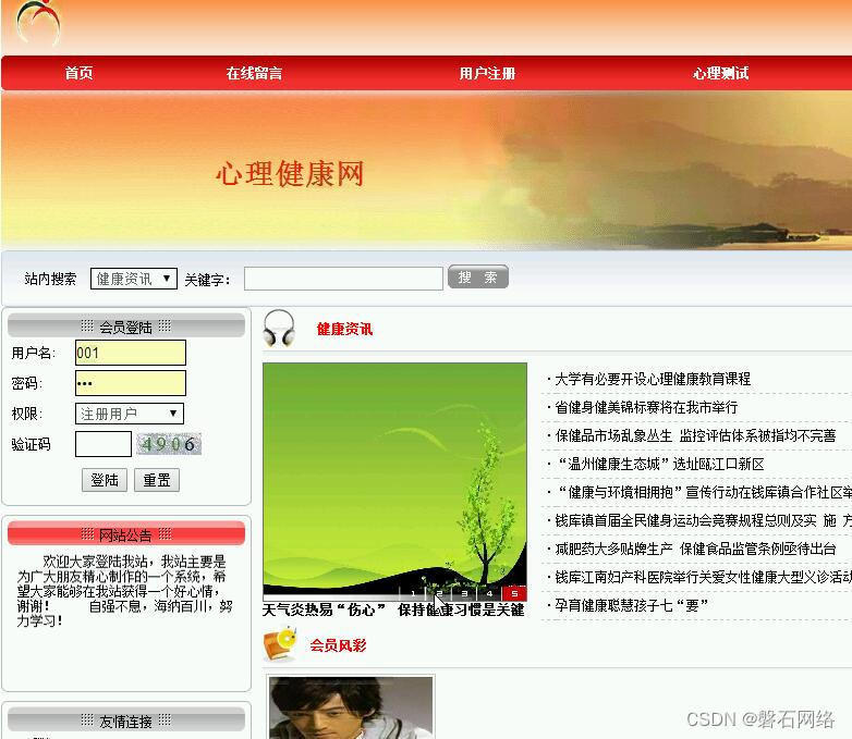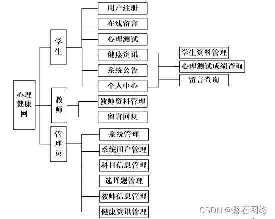 本系统首先在网站前台,游客用户可以经过账号注册,管理员审核通过后,用账号密码登录网站前台,查看健康资讯、留言信息等栏目信息,进行在线留言、心理测试,在前台用户可以通过标题和类别进行前台信息的搜索,用户可以登录个人中心进行学生资料管理、心理测试成绩查询、留言查询等功能。后台主要由管理员使用,以管理员的身份在登录页面输入账号和密码,经过数据库身份验证,验证成功后登录系统主页,可以使用系统用户管理、科目信息管理、选择题管理、教师信息管理、健康资讯管理、系统管理等功能,