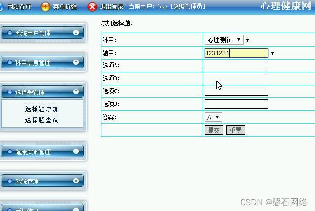 9.心理测试:在网站前台,用户进行心理测试,测试采用单选题,用户选择答案后,提交试卷,系统自动计算出成绩。