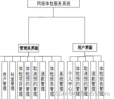 通过软件的需求分析已经获得了系统的基本功能需求,根据需求,将网络体检服务系统功能模块主要分为管理员模块。管理员添加个人中心、用户管理、退款管理,体检项目管理、取消预约管理等操作