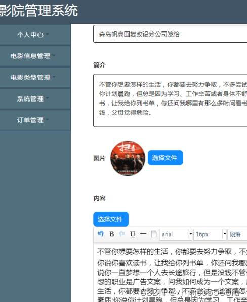 管理员登陆后,主要模块包括个人中心,电影信息管理,电影类型管理,系统管理,订单管理等功能。