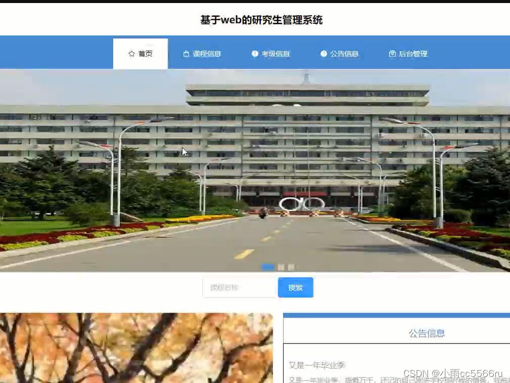 前台客户端主要的功能为:首页,课程信息,考级信息,公告信息,后台管理等功能进行操作。