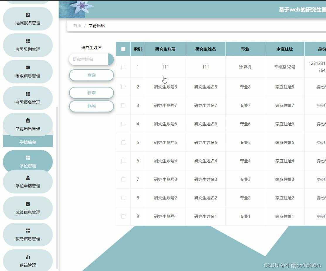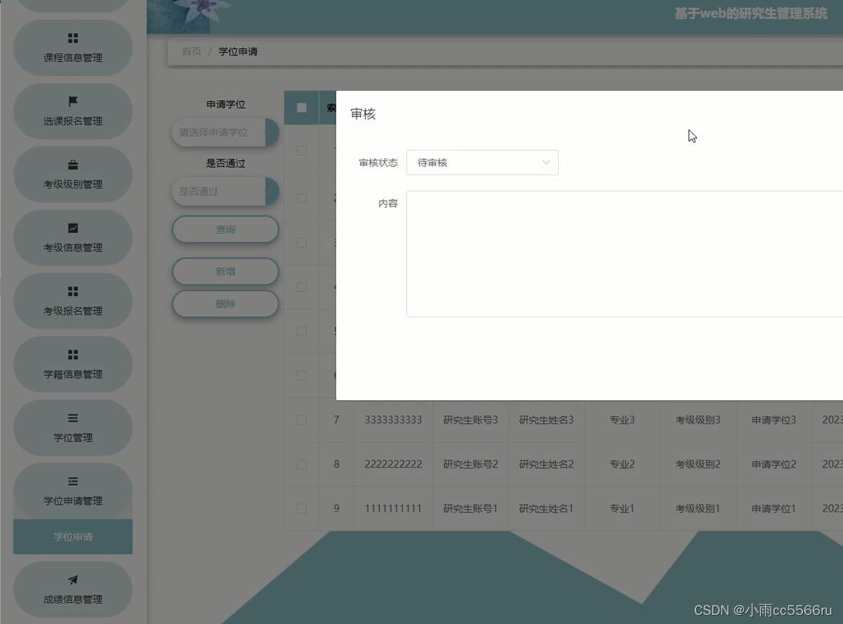 后台管理端主要功能为:首页,个人中心,研究生管理,导师管理,导师信息管理,课程分类管理,课程信息管理,选课信息管理,考级级别管理,考级信息管理,考级报名管理,学籍信息管理,学位管理,学位申请管理,成绩信息管理,教务信息管理,系统管理等功能。