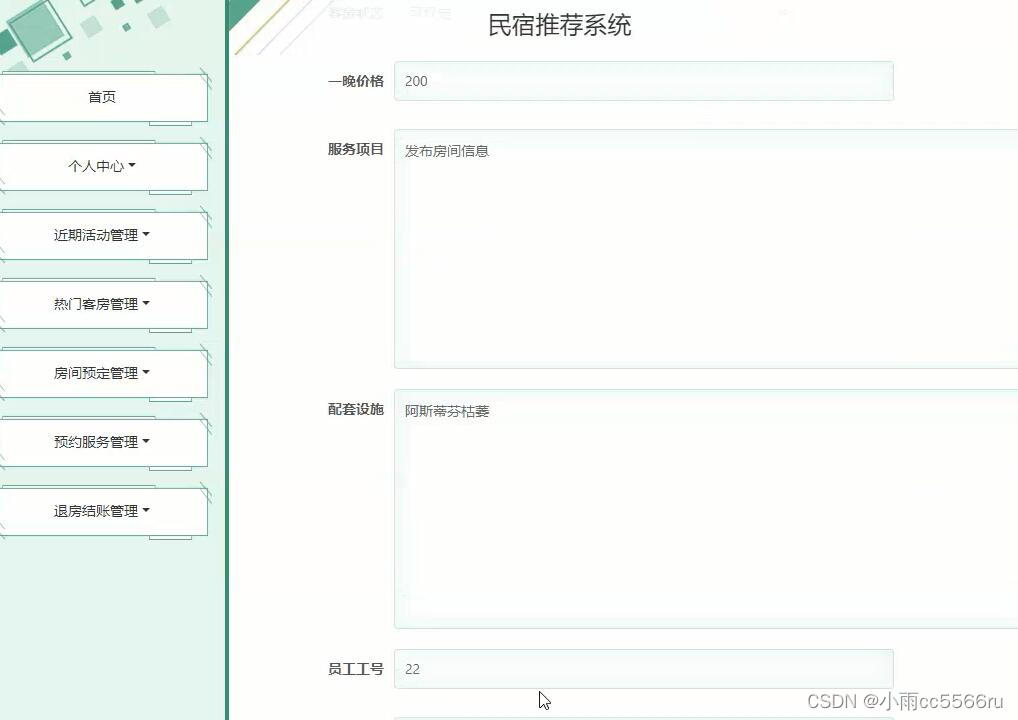 本文介绍了利用Java、B/S架构和MySQL技术开发的民宿推荐管理系统,通过管理员、用户和员工模块简化信息管理,强调了系统发布、信息获取与安全性的设计。系统支持用户登录、信息管理等功能,旨在提升民宿推荐效率和用户体验。