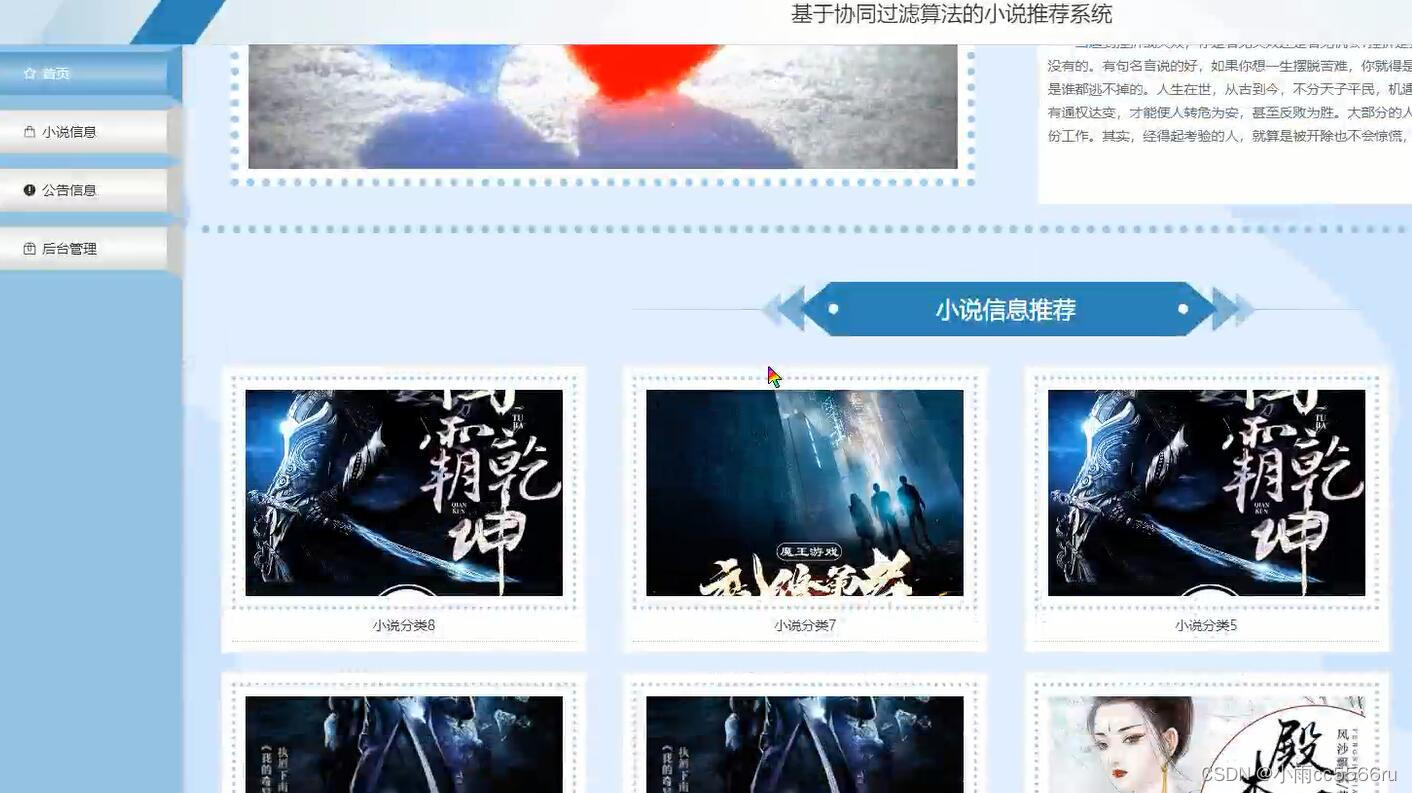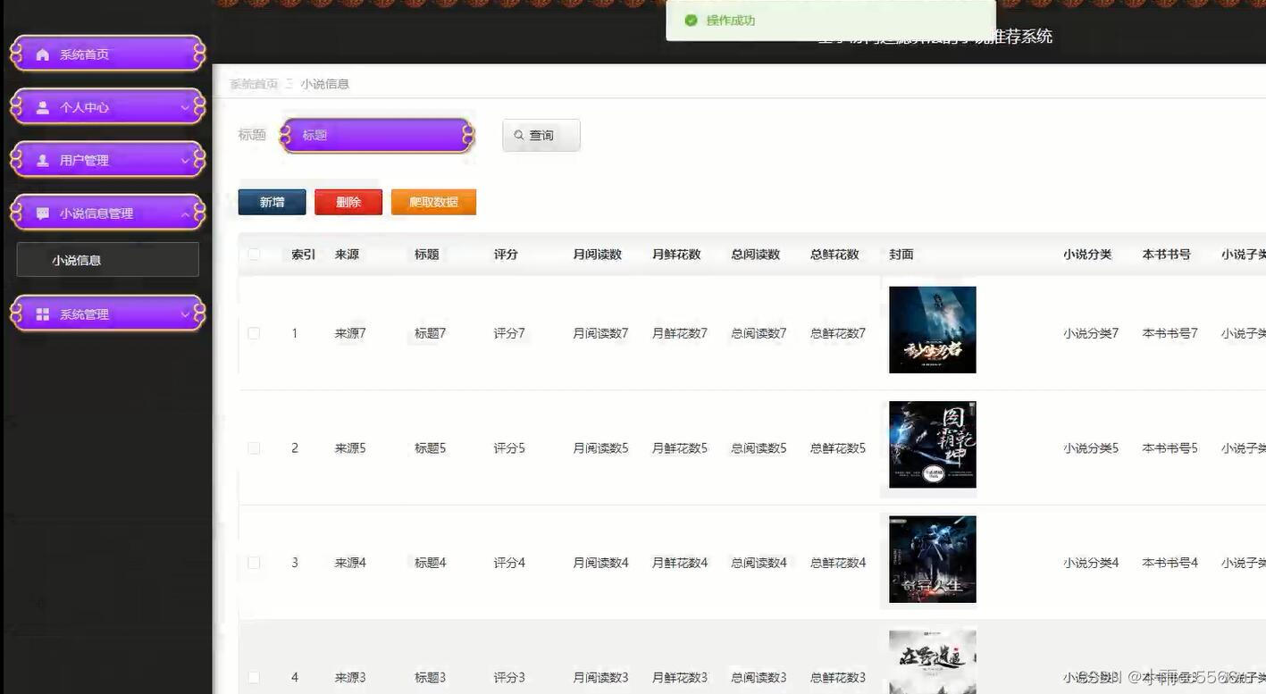 以需求为依据,对目前传统的管理进行了较为详尽的了解和分析。根据需求分析结果进行了系统的设计,网站主要功能包括对个人中心、用户管理、小说信息管理、系统管理等进行管理。使用目前市场主流的技术 springboot框架构建,使用java开发语言和MySQL数据库对系统进行高内聚低耦合的设计,最终完成了小说推荐系统的实现。