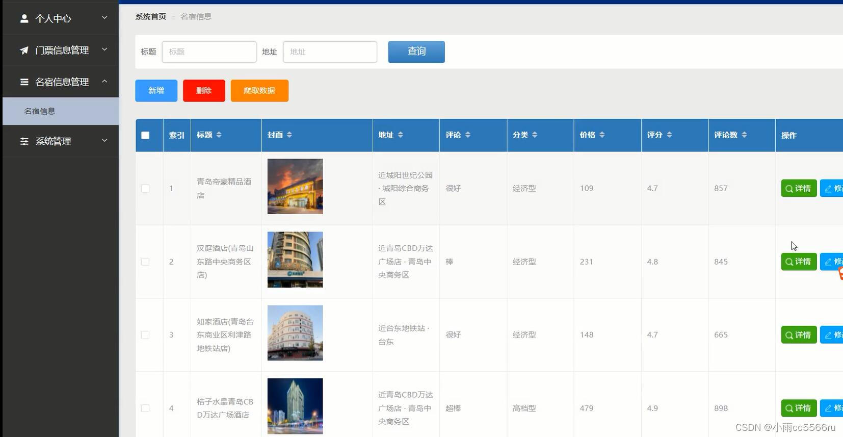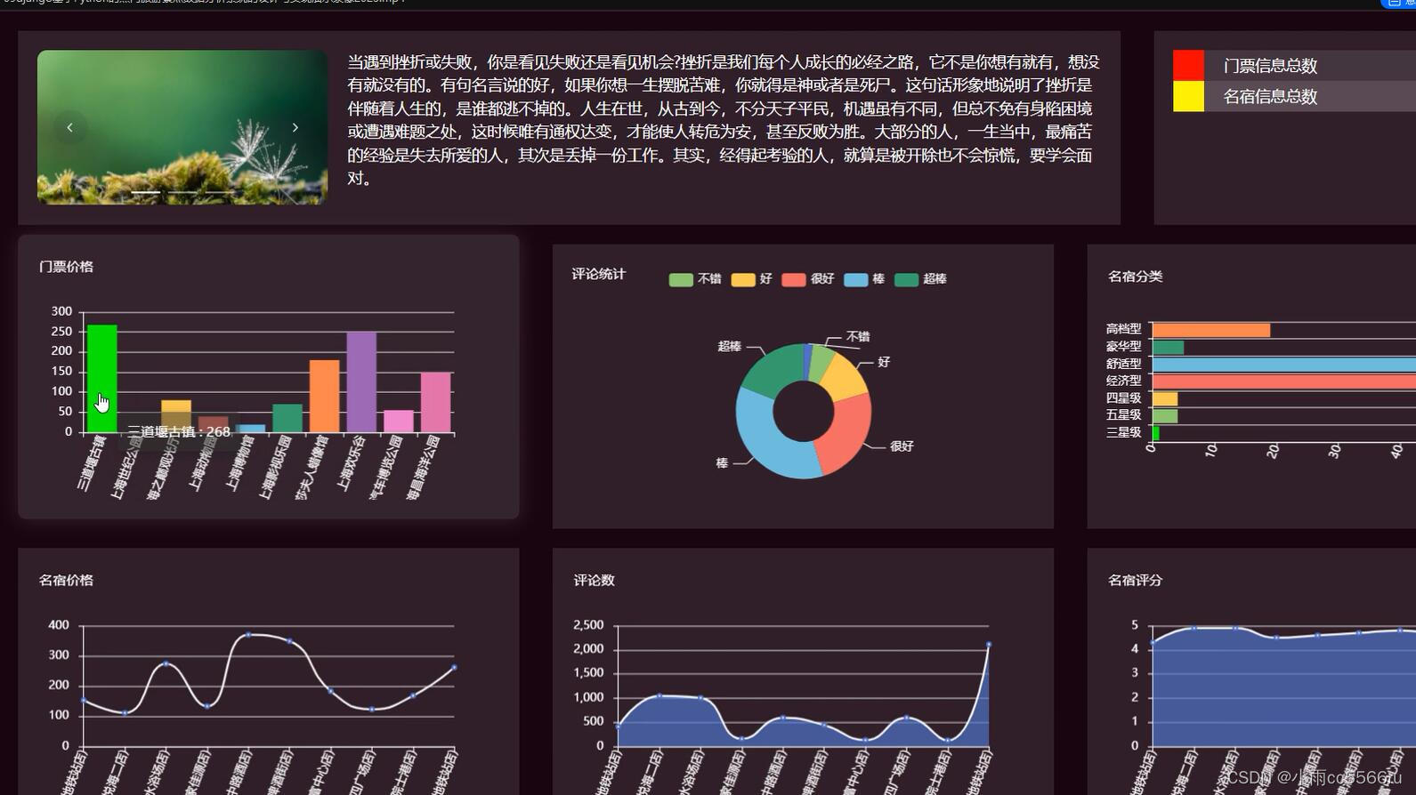 热门旅游景点数据分析系统综合网络空间开发设计要求。目的是将传统管理方式转换为在网上管理,完成热门旅游景点数据分析管理的方便快捷、安全性高、交易规范做了保障,目标明确。热门旅游景点数据分析系统功能主要包括个人中心、门票信息管理、名宿信息管理、系统管理等进行管理。整个的系统的开发运用Python技术, django框架,以及MySql数据库技术的大力支持下同步完成该系统的开发,实现了热门旅游景点数据分析的信息化,使管理者在操作思路清晰且更加方便,用户也可以体验到更加优秀的热门旅游景点数据分析管理,内容目标如下。