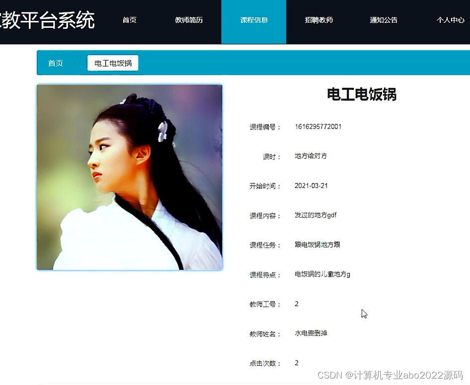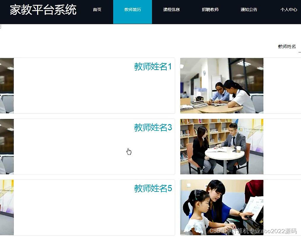 前台首页;教师简历、课程信息、招聘教师、通知公告、个人中心、后台管理,