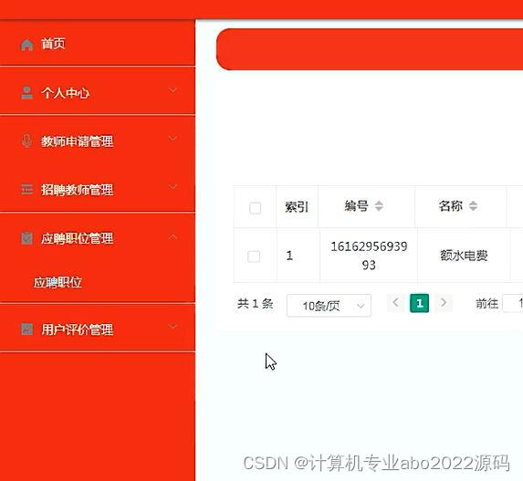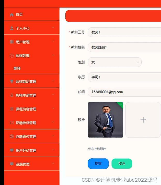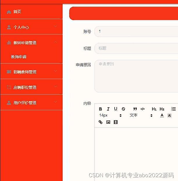 用户后台;教师申请管理、招聘教师管理、应聘职位管理、用户评价管理等功能