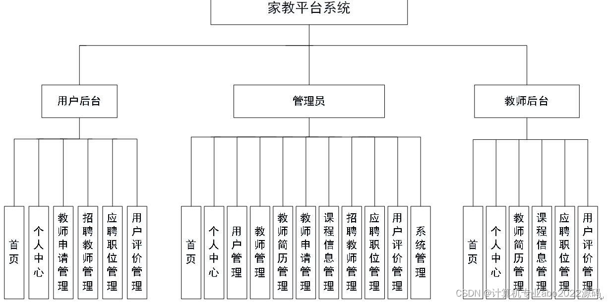 管理员:用户管理、教师管理、教师简历管理、教师申请管理、课程信息管理、招聘教师管理、应聘职位管理、用户评价管理、系统管理;