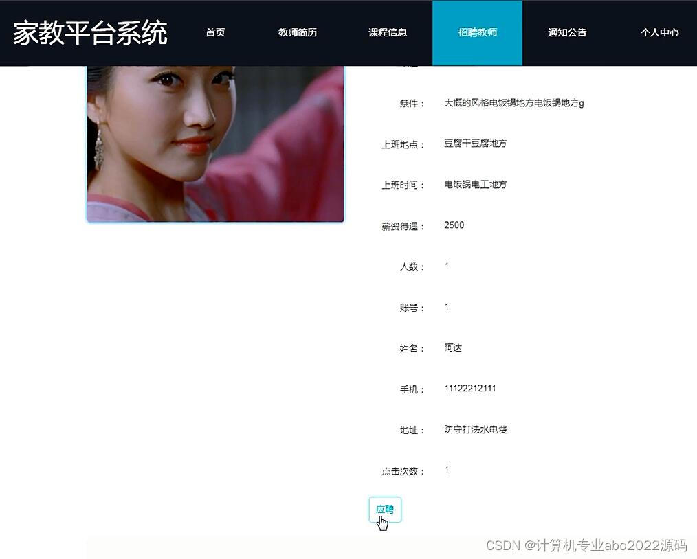 本系统为家教服务提供一个交流的平台,使学员能够在本系统中找到适合自己的家教,也使有做家教意愿的人群能够发布自己的简历.。