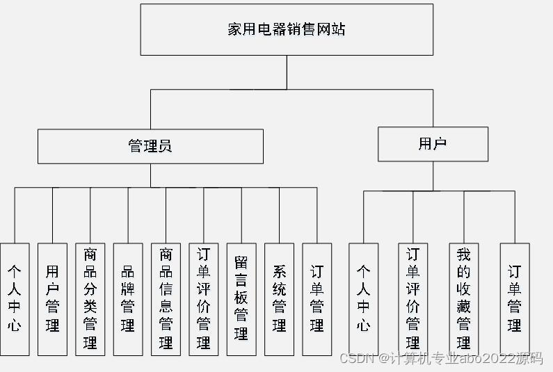 根据系统所需功能,本课题主要是以Java技术为开发语言,开发一个家用电器购物系统,家电购物系统是由前台用户和后台管理员组成的,又分别由不同的角色构成,其中不同的角色所具备的功能也是不同的