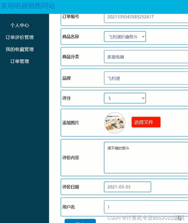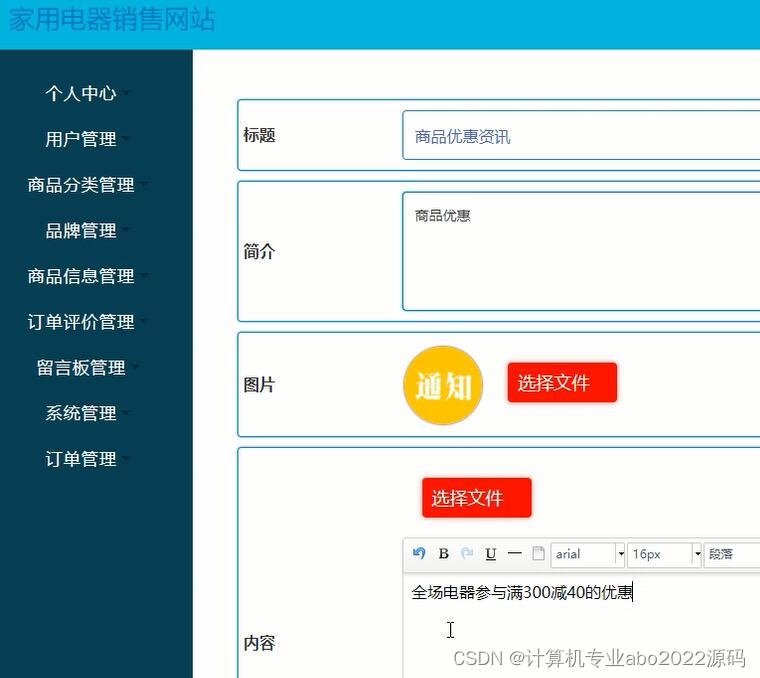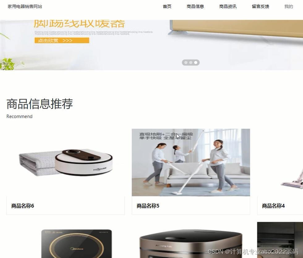 本网站系统使用动态网页开发JSP技术,Java作为系统的开发语言,MySQL作为后台数据库。设计开发了具有管理员;个人中心、用户管理、商品分类管理、品牌管理、商品信息管理、订单评价管理、留言板管理、系统管理、订单管理,用户;个人中心、订单评价管理、我的收藏管理、订单管理,前台首页;首页、商品信息、商品资讯、留言反馈、我的、跳转到后台、购物车等功能的家用电器销售网站。在设计过程中,充分保证了系统代码的良好可读性、实用性、易扩展性、通用性、便于后期维护、操作方便以及页面简洁等特点。