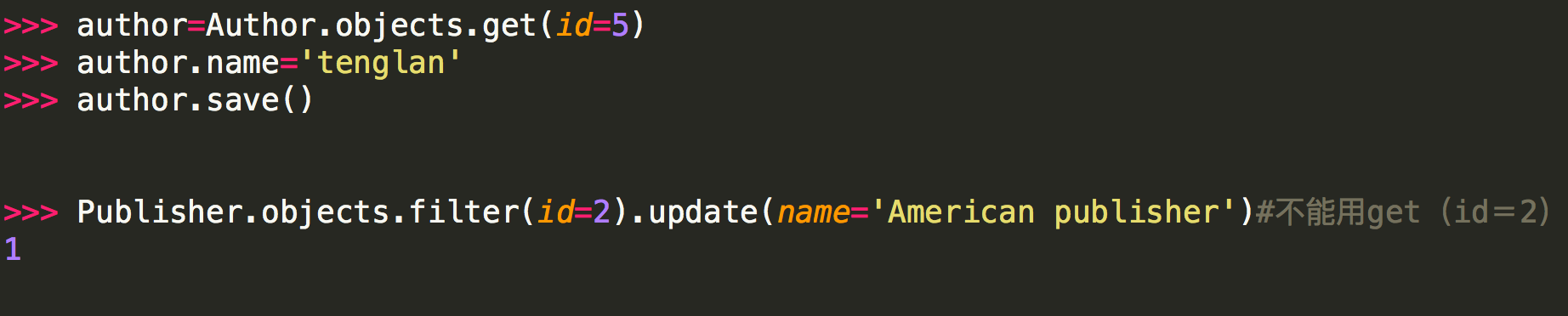 <1> 第二种方式修改不能用get的原因是:update是QuerySet对象的方法,get返回的是一个model对象,它没有update方法,而filter返回的是一个QuerySet对象(filter里面的条件可能有多个条件符合,比如name='alvin',可能有两个name='alvin'的行数据)。