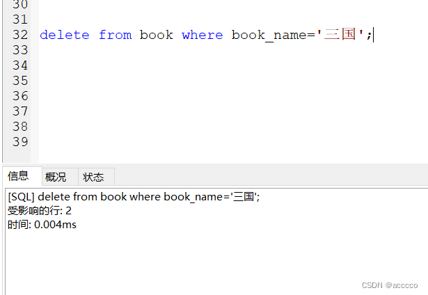 3.使用delete语句仅删除符合where条件的行的数据,不删除表中其他行和表本身