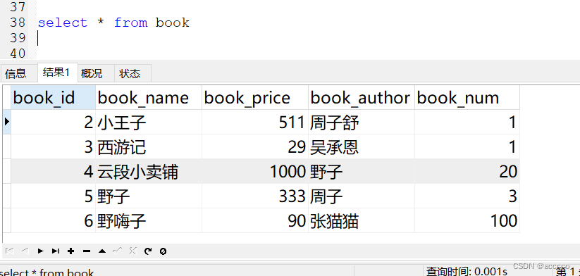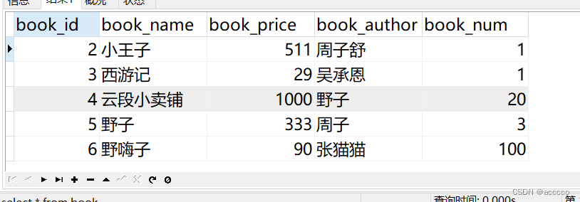 查询到book表中出现一条新增进去的信息,即为新增成功。