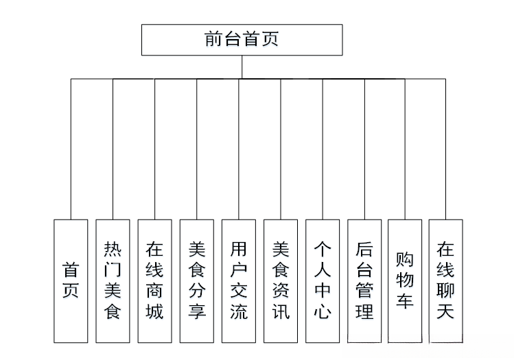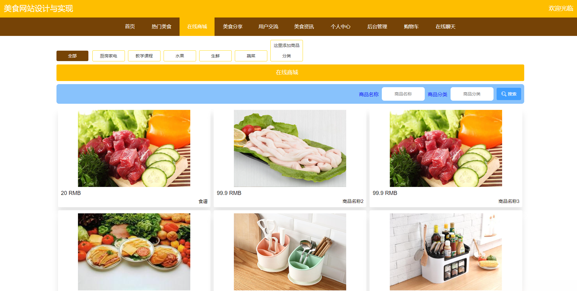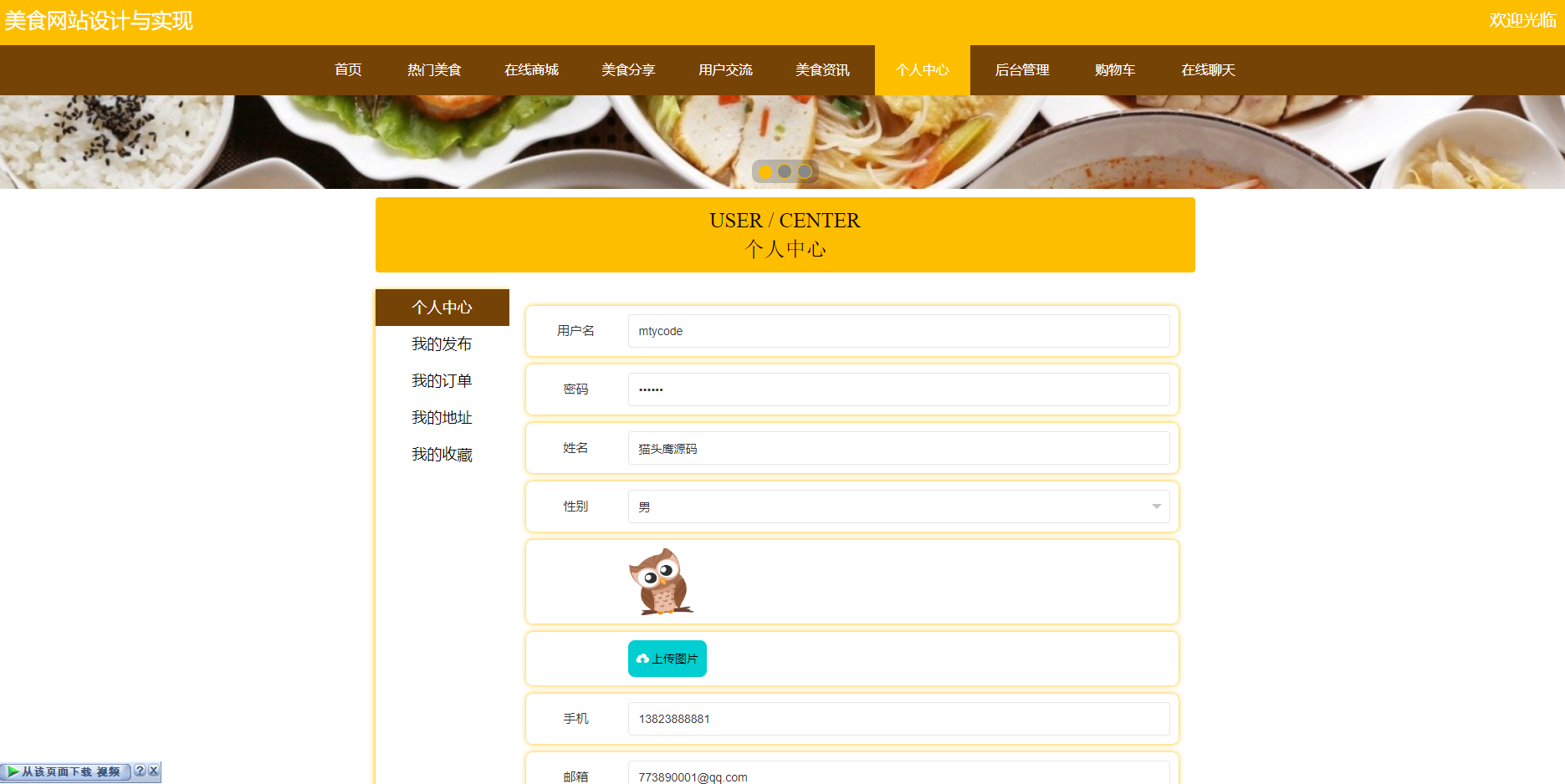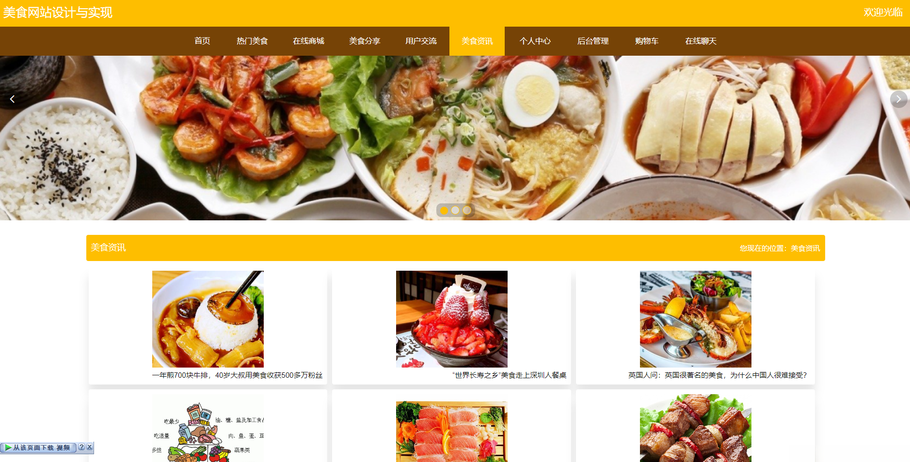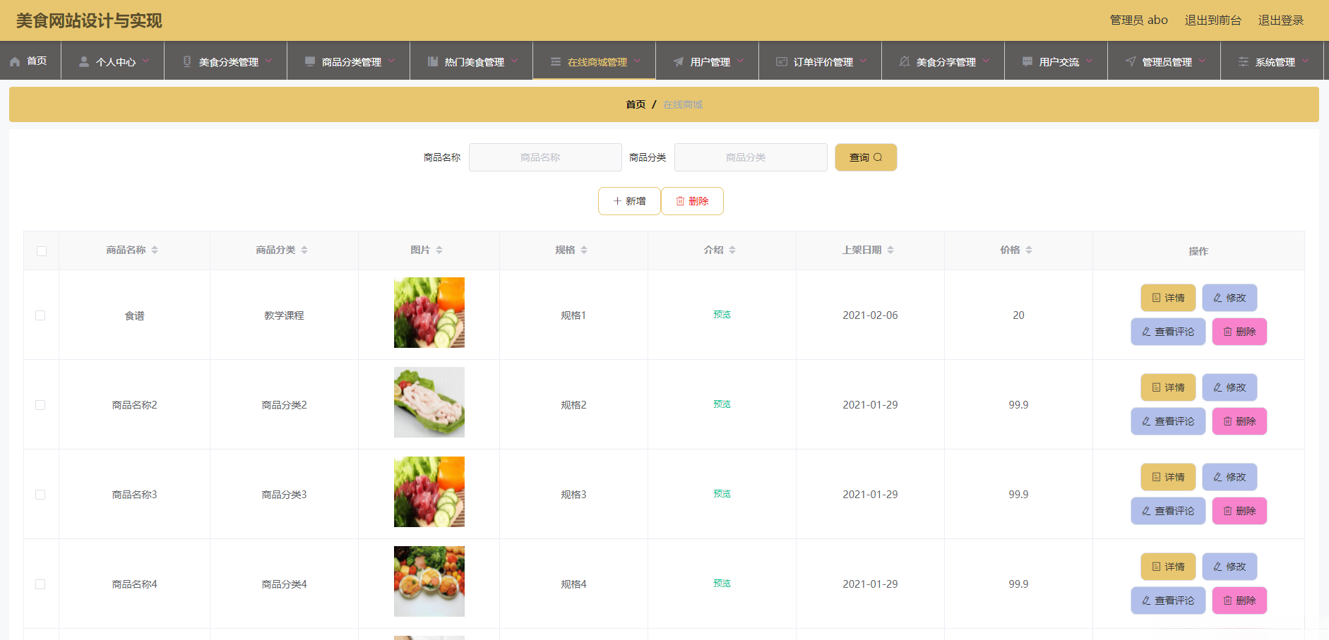 (3)前台首页:首页、热门美食、在线商城、美食分享、用户交流、美食资讯、个人中心、后台管理、购物车、在线聊天等功能