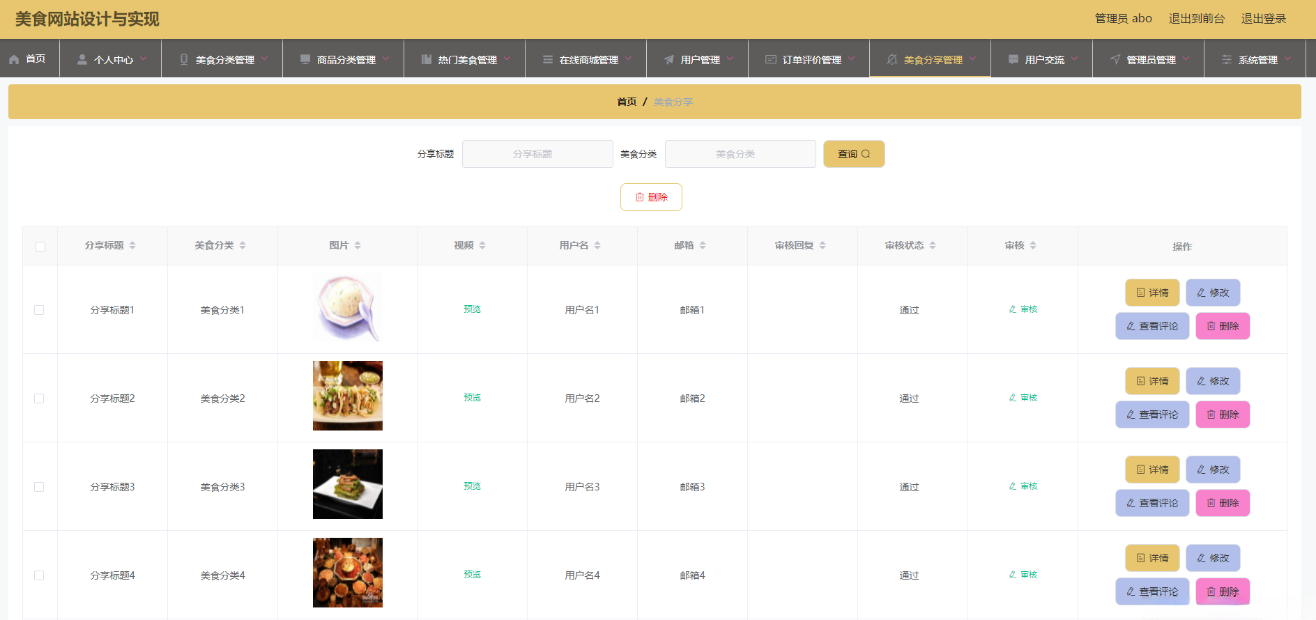 (2)用户:首页、个人中心、订单评价管理、美食分享管理、我的收藏管理等功能