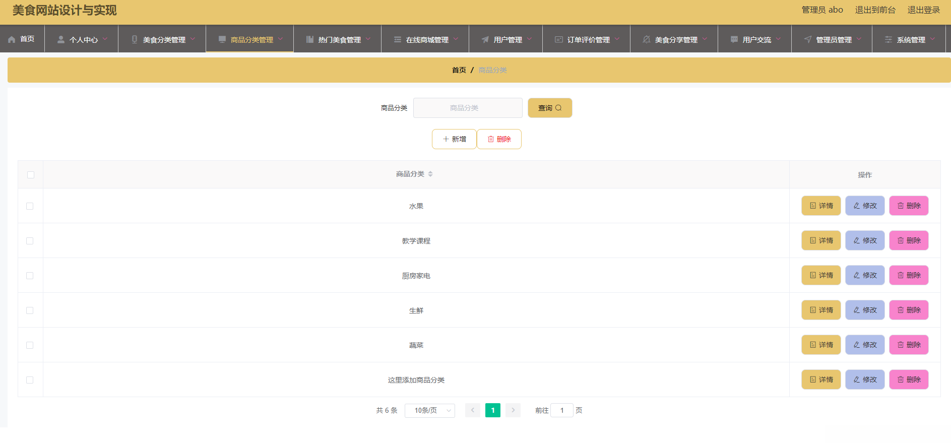 (1)管理员模块:系统中的核心用户是管理员,管理员登录后,通过管理员功能来管理后台系统。主要功能有:首页、个人中心、美食分类管理、商品分类管理、热门美食管理、在线商城管理、用户管理、订单评价管理、美食分享管理、用户交流、管理员管理、系统管理、订单管理等功能。
