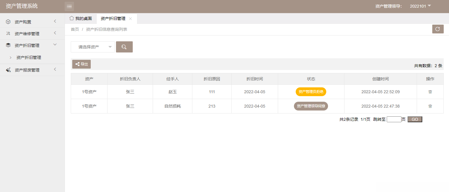 /** * 分页查询 * pageIndex 当前页码 * pageSize 显示条数 */ @RequestMapping(value = "/findAssets") public String findAssets(Integer pageIndex, Integer pageSize,String no,String name, Model model,HttpServletRequest request) { HttpSession session = request.getSession(); if(session.getAttribute("ad") == null){ session.setAttribute("msg", "对不起,请登录!"); return "login"; } Map mp = new HashMap(); String type = (String)session.getAttribute("type"); if(type.equals("02")){ Manage manage = (Manage)session.getAttribute("ad"); mp.put("mid",manage.getId()); } mp.put("no",no); mp.put("name",name); PageInfo<Assets> pageList = assetsService.findPageInfo(pageIndex,pageSize,mp); model.addAttribute("pageList",pageList); return "AssetsList"; } /** * 分页查询 * pageIndex 当前页码 * pageSize 显示条数 */ @RequestMapping(value = "/findAssets2") public String findAssets2(Integer pageIndex, Integer pageSize,String no,String name, Model model,HttpServletRequest request) { HttpSession session = request.getSession(); if(session.getAttribute("ad") == null){ session.setAttribute("msg", "对不起,请登录!"); return "login"; } Map mp = new HashMap(); String type = (String)session.getAttribute("type"); if(type.equals("02")){ Manage manage = (Manage)session.getAttribute("ad"); mp.put("mid",manage.getId()); } mp.put("no",no); mp.put("name",name); PageInfo<Assets> pageList = assetsService.findPageInfo(pageIndex,pageSize,mp); model.addAttribute("pageList",pageList); return "AssetsList2"; } /** * 添加 */ @RequestMapping(value = "/addAssets" ,method = RequestMethod.POST) @ResponseBody public String addAssets( @RequestBody Assets assets,HttpServletRequest request) { try{ HttpSession session = request.getSession(); if(session.getAttribute("ad") == null){ session.setAttribute("msg", "对不起,请登录!"); return "login"; } List<Assets> all = assetsService.getAll(); for(int i=0;i<all.size();i++){ if(all.get(i).getNo().equals(assets.getNo())){ return "202"; } } Manage manage = (Manage)session.getAttribute("ad"); assets.setMid(manage.getId()); SimpleDateFormat sf = new SimpleDateFormat("yyyy-MM-dd HH:mm:ss"); assets.setCreateTime(sf.format(new Date())); assetsService.addAssets(assets); return "200"; }catch (Exception e){ e.printStackTrace(); return "201"; } } /** * 导出excel */ @RequestMapping("/downExcel") public void downExcel(HttpServletRequest request, HttpServletResponse response) throws Exception{ HttpSession session = request.getSession(); String type = (String)session.getAttribute("type"); List<Assets> assetsList = new ArrayList<>(); if(type.equals("02")){ Manage manage = (Manage)session.getAttribute("ad"); Map mp = new HashMap(); mp.put("mid",manage.getId()); assetsList = assetsService.queryFilter(mp); for(int i=0;i<assetsList.size();i++){ if(assetsList.get(i).getMid()!=null){ Manage manageById = manageService.findManageById(assetsList.get(i).getMid()); assetsList.get(i).setMname(manageById.getName()); } if(assetsList.get(i).getStatus().equals("01")){ assetsList.get(i).setStatus("已申请"); } if(assetsList.get(i).getStatus().equals("02")){ assetsList.get(i).setStatus("已同意"); } if(assetsList.get(i).getStatus().equals("03")){ assetsList.get(i).setStatus("已拒绝"); } } } String[] columnNames = { "ID","资产编号","资产型号","资产名称","单价", "生产厂商", "生产日期", "入库时间", "购买人", "购买人", "资产类型", "状态", "创建时间"}; String fileName = "资产信息表"; ExportExcelUtil exportExcelUtil = new ExportExcelUtil(); exportExcelUtil.mtyExcel(fileName, fileName, columnNames, assetsList, response, ExportExcelUtil.EXCEL_FILE_2003); } /** * 删除 */ @RequestMapping( "/deleteAssets") @ResponseBody public String deleteAssets(String id) { int d = assetsService.deleteAssets(id); return "AssetsList"; } /** * 修改 */ @RequestMapping( "/updateAssets") @ResponseBody public String updateAssets(@RequestBody Assets assets) { try{ List<Assets> all = assetsService.getAll(); for(int i=0;i<all.size();i++){ if(all.get(i).getNo().equals(assets.getNo()) && !all.get(i).getId().equals(assets.getId())){ return "202"; } } assetsService.updateAssets(assets); return "200"; }catch (Exception e){ e.printStackTrace(); return "201"; } } /** * 按照ID查询 */ @RequestMapping( "/findAssetsById") @ResponseBody public Assets findAssetsById(String id,Model model,HttpServletRequest request) { Assets assets= assetsService.findAssetsById(id); return assets; }