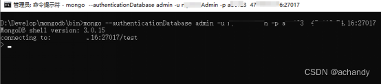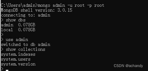 >mongo admin -u admin -p 123456 // 通过用户名为:admin 密码为:123456 (本地连接方法)