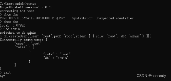 db.createUser({user: "root",pwd: "root",roles: [ { role: "root", db: "admin" } ]})