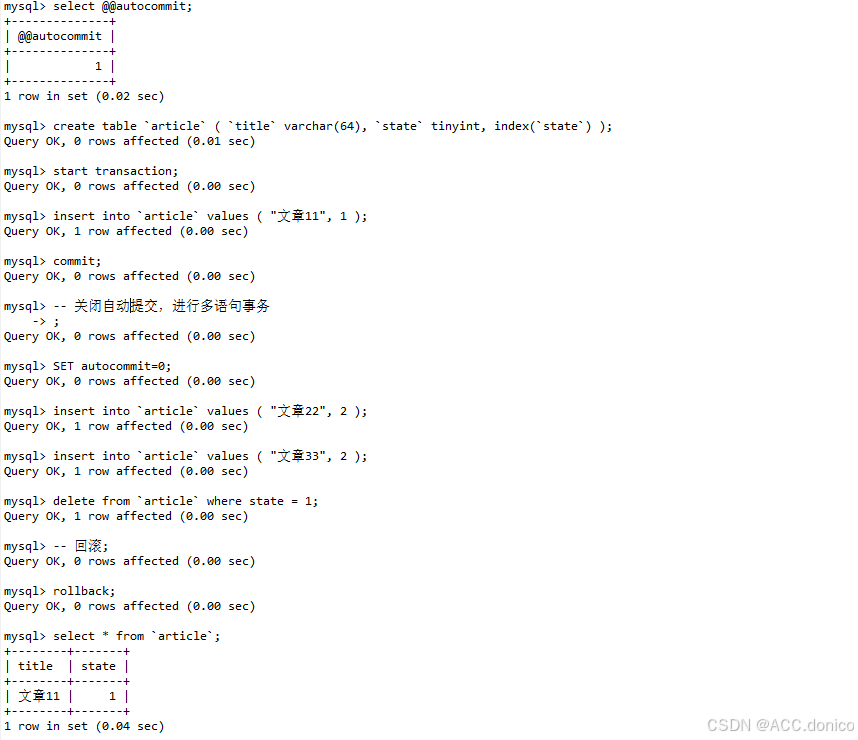 补充:在我们开启事务时,autocommit会在会话被隐式禁用,直到使用commit/rollback结束事务。与我们手动设置效果大差不差。具体看【开启事务】
