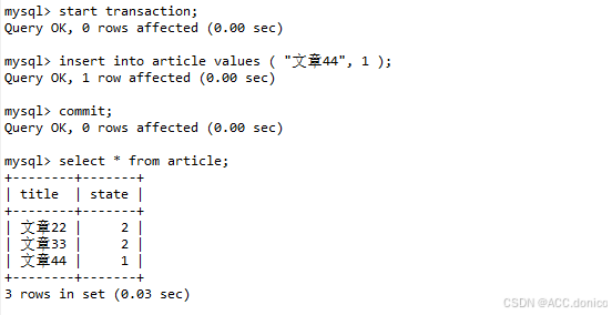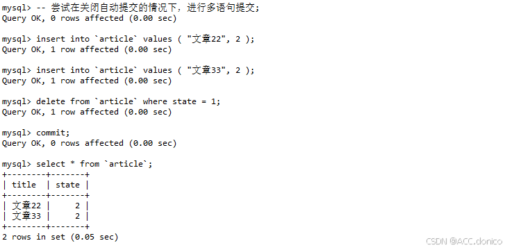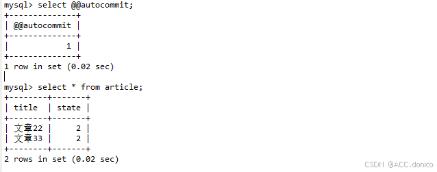 #手动关闭自动提交模式,插入”文章22”、”文章33”,删除”文章11”,commit - 查看数据;
