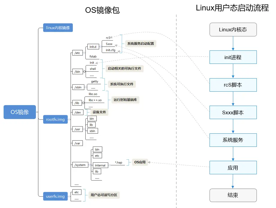图1 基于linux内核的OS镜像结构和用户态程序启动流程
