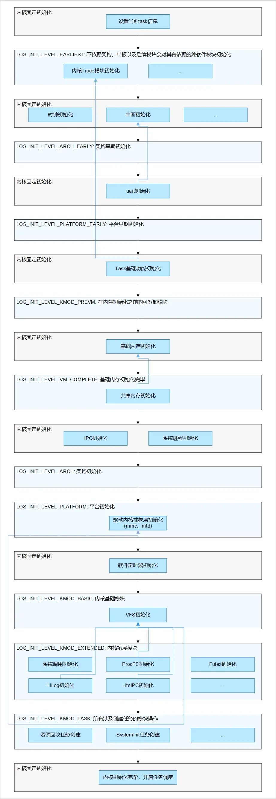 | LOS_INIT_LEVEL_KMOD_EXTENDED | 内核扩展模块初始化 说明:内核可拆卸的扩展模块初始化 例如:系统调用初始化、ProcFS初始化、Futex初始化、HiLog初始化、HiEvent初始化、LiteIPC初始化 |