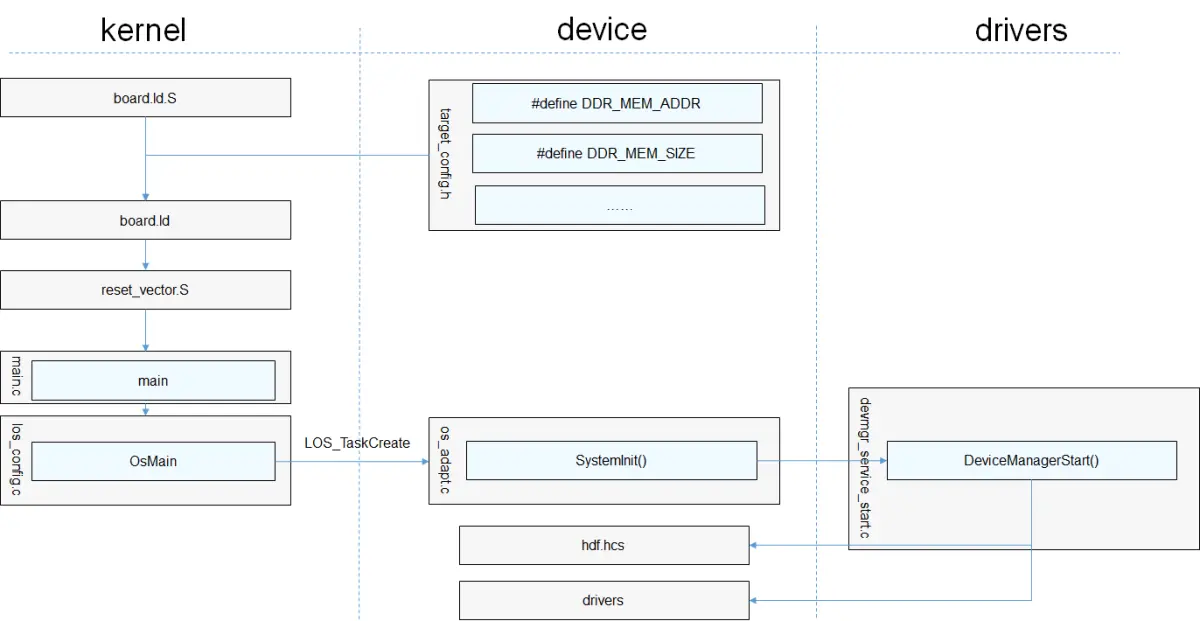 SystemInit任务在单板代码中实现,其中调用DeviceManagerStart函数进行HDF驱动初始化,这个过程会调用单板代码中的驱动配置文件hdf.hcs以及drivers源码实现