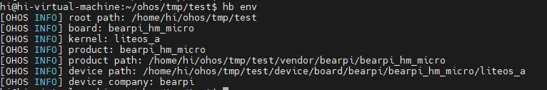 选择好产品后,输入回车就会在根目录下自动生成ohos_config.json文件,这里会将要编译的产品信息列出。通过hb env也可以查看选择出来的预编译环境变量。