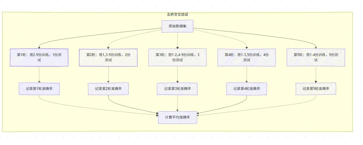 交叉验证通过多次划分数据、重复训练测试,有效解决上述问题,成为模型评估的标准流程。