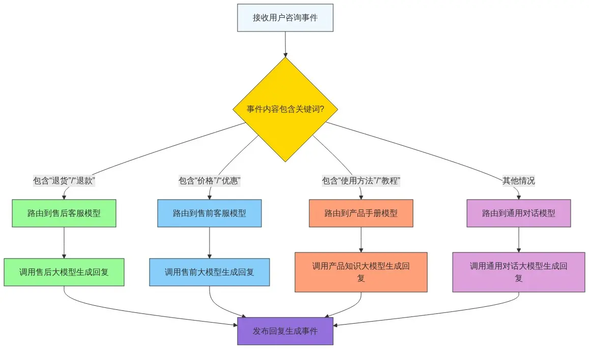 - 动态路由:“用户咨询”事件中,包含“退货”关键词的路由到售后客服模型,其他路由到售前客服模型;