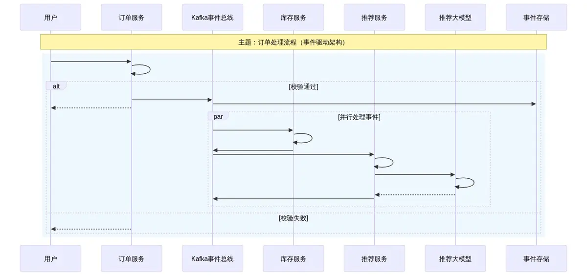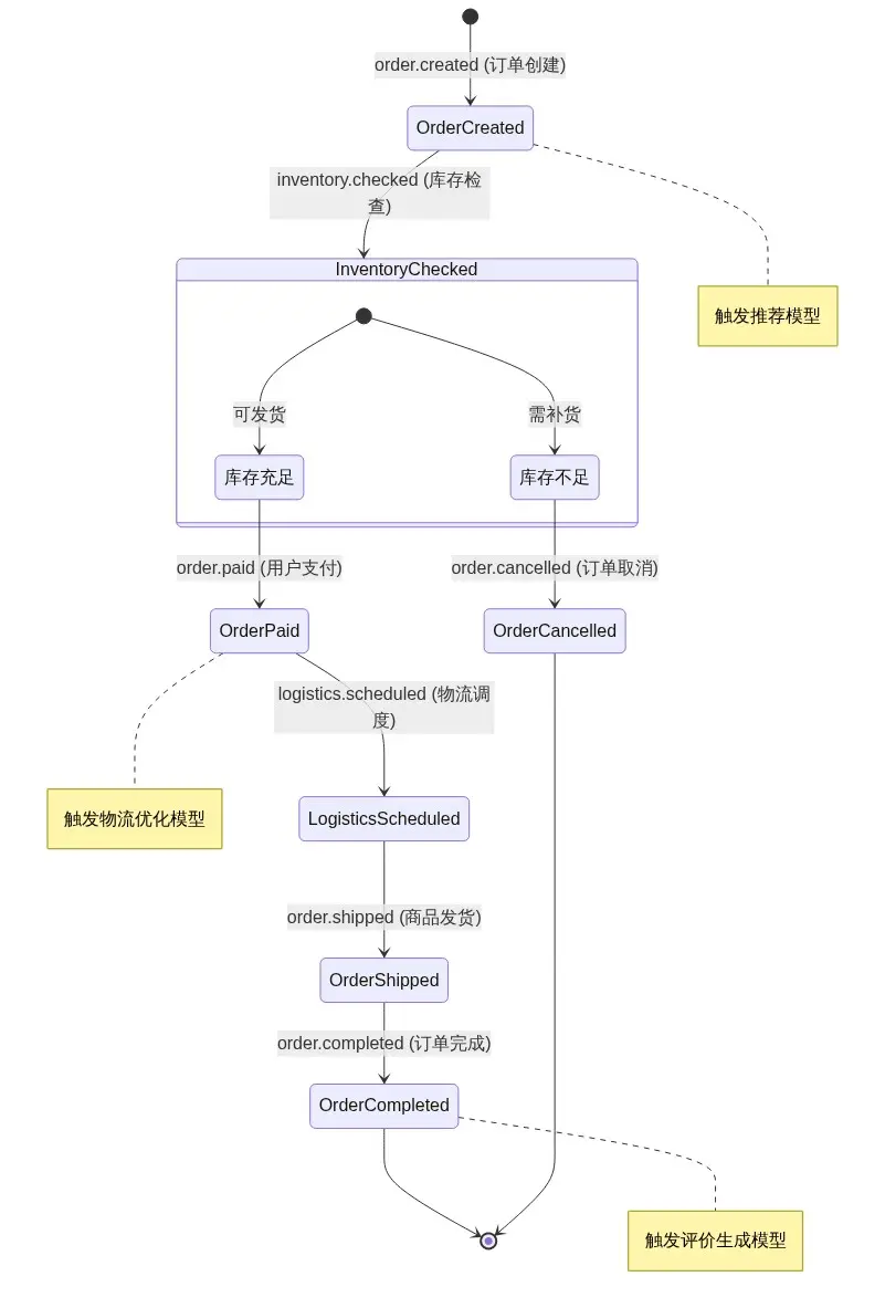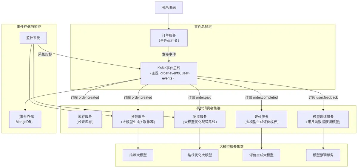 为让架构设计更具体,我们以“电商订单全链路处理系统”为例,解析如何用事件驱动架构集成大模型能力,实现“订单创建→库存检查→智能推荐→物流调度→售后分析”的全流程自动化。