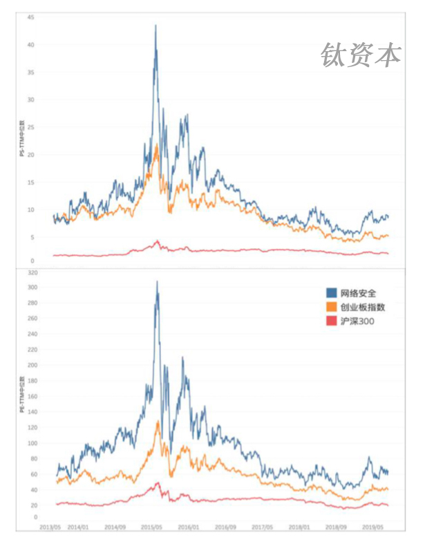 网络安全行业的上市公司和市场主要指数的估值水平对比来看,网络安全行业估值水平是明显高于创业板指数,也高于沪深300指数,可见资本市场对于网络安全概念的青睐,资本也更愿意给予网络安全公司较高的溢价,比如安博通现在PE有150以上。当前网络安全公司的估值总体是处于历史的中位水平。另外,还可以看到网络安全公司估值的中枢波动与行业主要指数几乎同步,说明网络安全公司市值与资本市场热度关系紧密。