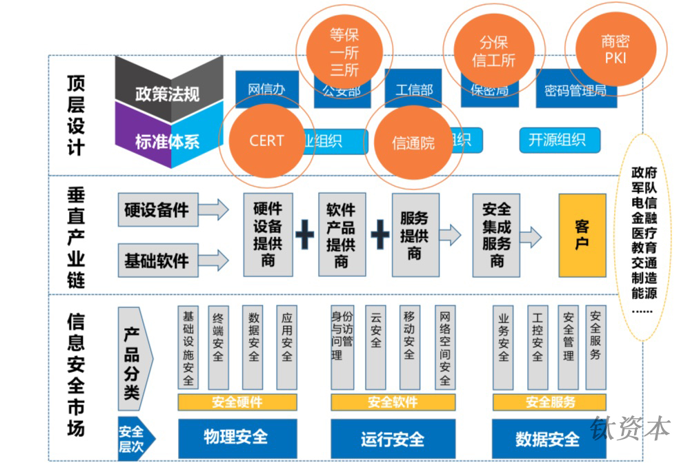 从行业价值链分析,有顶层设计、垂直产业链和信息安全市场。现在网络空间安全行业本质上还是一个合规牵引、合规驱动的行业,所以有信通院、公安部一所三所、保密局的分保信工所等等一系列行业组织。由于网络安全行业的碎片化及各种技术应用场景的复杂性,缺乏统一的名词定义,所以网络安全的产品与服务的分类也有多个维度:比如根据保护对象可分为网络通信、终端设备、数据安全等;从需求领域的维度上又可划分为公共安全、办公安全、业务安全等;从IT技术框架的维度,则可分为基础建设、金融安全、移动安全。另外,一旦某个细分领域的市场规模足够大,会自成一个品类,如防火墙、漏洞扫描、态势感知等。