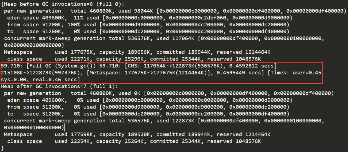 红框部分的现象跟上面的现象差不多,红框上面是gc前堆中各区域的使用情况,红框下面是gc后堆中各区域的使用情况,可以看出这次gc后新生代确实被清空了(eden、form和to区使用量都为0%),老年代占用内存变大,再反观之前的由于元空间内存不足而发生的Full GC同样也是清空了年轻代,由此可以推论出Full GC会对整个堆进行垃圾回收,并且会将年轻代存活的对象全部转移到老年代。